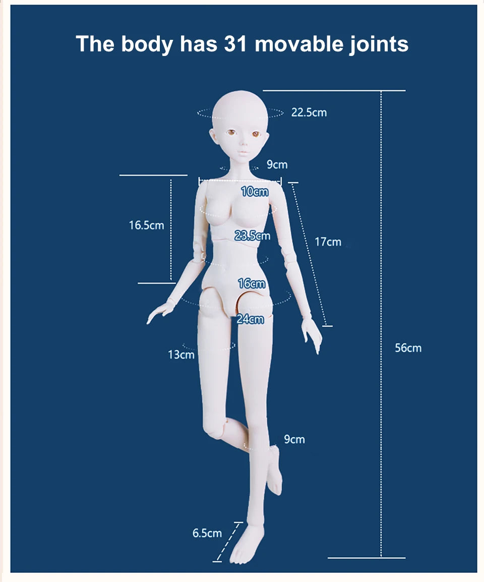 This 60 cm doll is fully poseable, with movable head and limbs. It features eyes that rotate to change color and a body compatible with other doll heads. The set includes a painted head, wig, eyes, clothes, shoes, and instructions. The doll weighs about 1.7 kg (2.4 lbs).