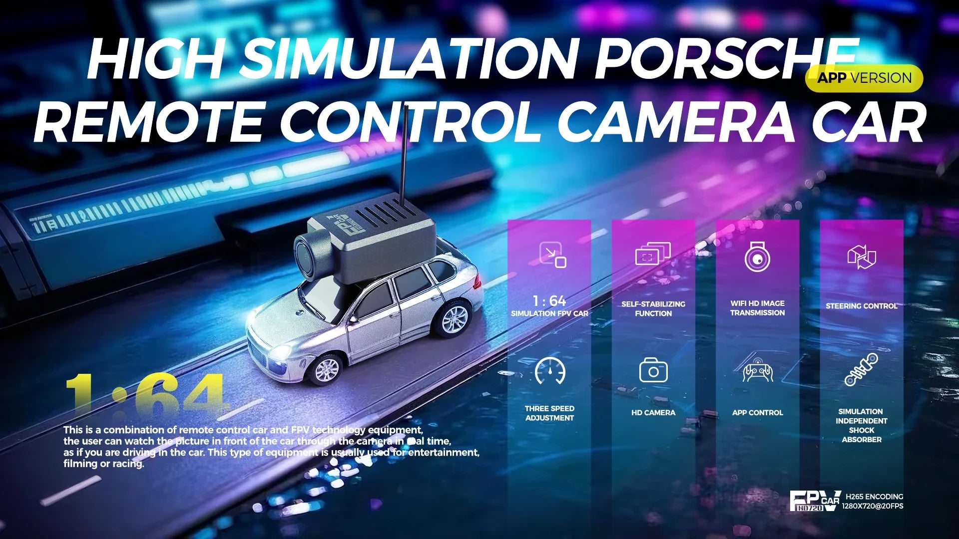 The 6401 Mini RC Car is a 1:64 scale racing toy with a 720P FPV camera and Wifi APP control. It features full proportional remote control with adjustable speeds, a built-in gyroscope for stability, and shock-absorbing front wheels. The car includes blue atmosphere lights and supports HD video transmission without delay. Designed for kids aged 6 to 12, it runs up to 3 km/h, offers about 15 minutes of use per charge, and supports a 30-meter control distance via the app. This ready-to-go car is perfect for indoor and outdoor fun.